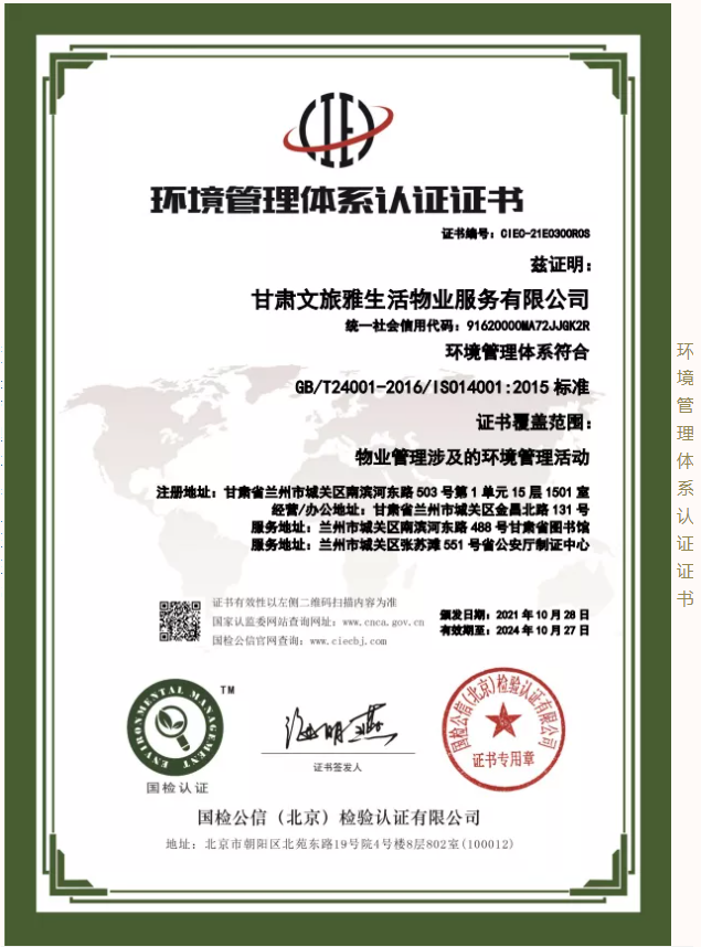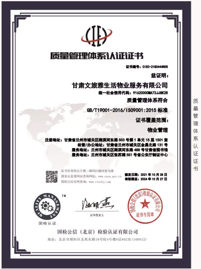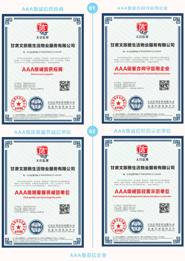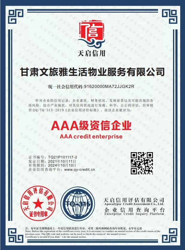 2021年,甘肅文旅雅生活物業(yè)服務(wù)有限公司認(rèn)真貫徹落實(shí)習(xí)近平新時代中國特色社會主義思想,堅決落實(shí)集團(tuán)公司各項決策部署。按照集團(tuán)公司高質(zhì)量發(fā)展要求,結(jié)合自身發(fā)展需要,公司于9月份正式啟動3A體系認(rèn)證工作,經(jīng)過權(quán)威認(rèn)證機(jī)構(gòu)對公司信用管理、制度建設(shè)、管理體系等方面綜合評估,10月底公司順利通過3A體系認(rèn)證,使得公司在管理水平、制度建設(shè)方面有了進(jìn)一步完善及提升,增強(qiáng)了公司核心競爭力和品牌影響力,為公司高質(zhì)量發(fā)展奠定了堅實(shí)的基礎(chǔ)。