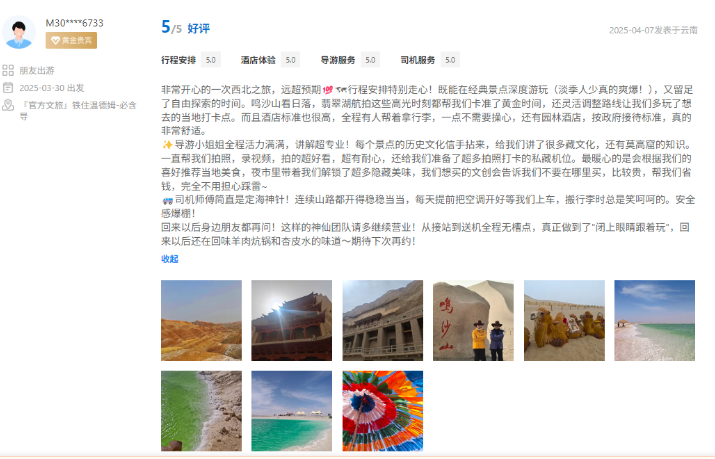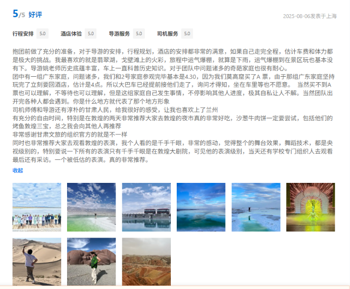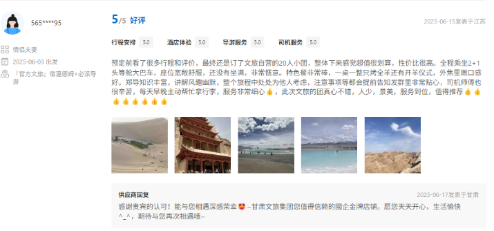 文旅國旅深度整合甘青兩地的經(jīng)典與小眾旅游資源,精心打造、上線行程豐富、體驗舒適產(chǎn)品的同時南京運營中心緊密圍繞游客核心需求,協(xié)同配備金牌工作人員隨團提供專業(yè)講解與服務,獲得廣泛好評。平臺數(shù)據(jù)顯示,近半年以來,其攜程店鋪訂單量同比增長超過40%,訂單完成率高達98.5%,展現(xiàn)出高度的市場認可與出色的運營效能。用戶口碑方面,店鋪好評率持續(xù)穩(wěn)步提升,目前已達4.9分,累計精選好評超千條,“質(zhì)量可信、服務可依”的品牌形象日益凸顯。