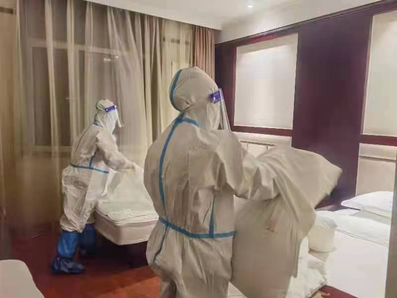 閉環(huán)服務(wù)期間,客房部員工面對(duì)疫情不畏懼不退縮,不計(jì)較個(gè)人得失,甚至有的同志帶病工作,卻仍然義無(wú)反顧堅(jiān)守崗位,累計(jì)閉環(huán)54天。11月10日,入住西樓的84名醫(yī)護(hù)人員臨時(shí)通知撤離,由甘肅省人民醫(yī)院緊急抽調(diào)的101名醫(yī)護(hù)人員入住換防。當(dāng)時(shí)飯店其他員工都在居家辦公,客房部18位輪休人員第一時(shí)間主動(dòng)請(qǐng)纓,努力說(shuō)服家人,自主到社區(qū)辦理通行證后趕到飯店,投入緊張的客房和公共區(qū)域衛(wèi)生清掃與消殺工作,直到凌晨2點(diǎn)。在這個(gè)特殊的時(shí)刻,飯店客房部員工筑起了牢固的防疫堡壘,堅(jiān)守著這個(gè)特殊的“戰(zhàn)場(chǎng)”,他們的默默奉獻(xiàn)與守護(hù)也成為了醫(yī)護(hù)人員眼中最可愛(ài)的“逆行者”。