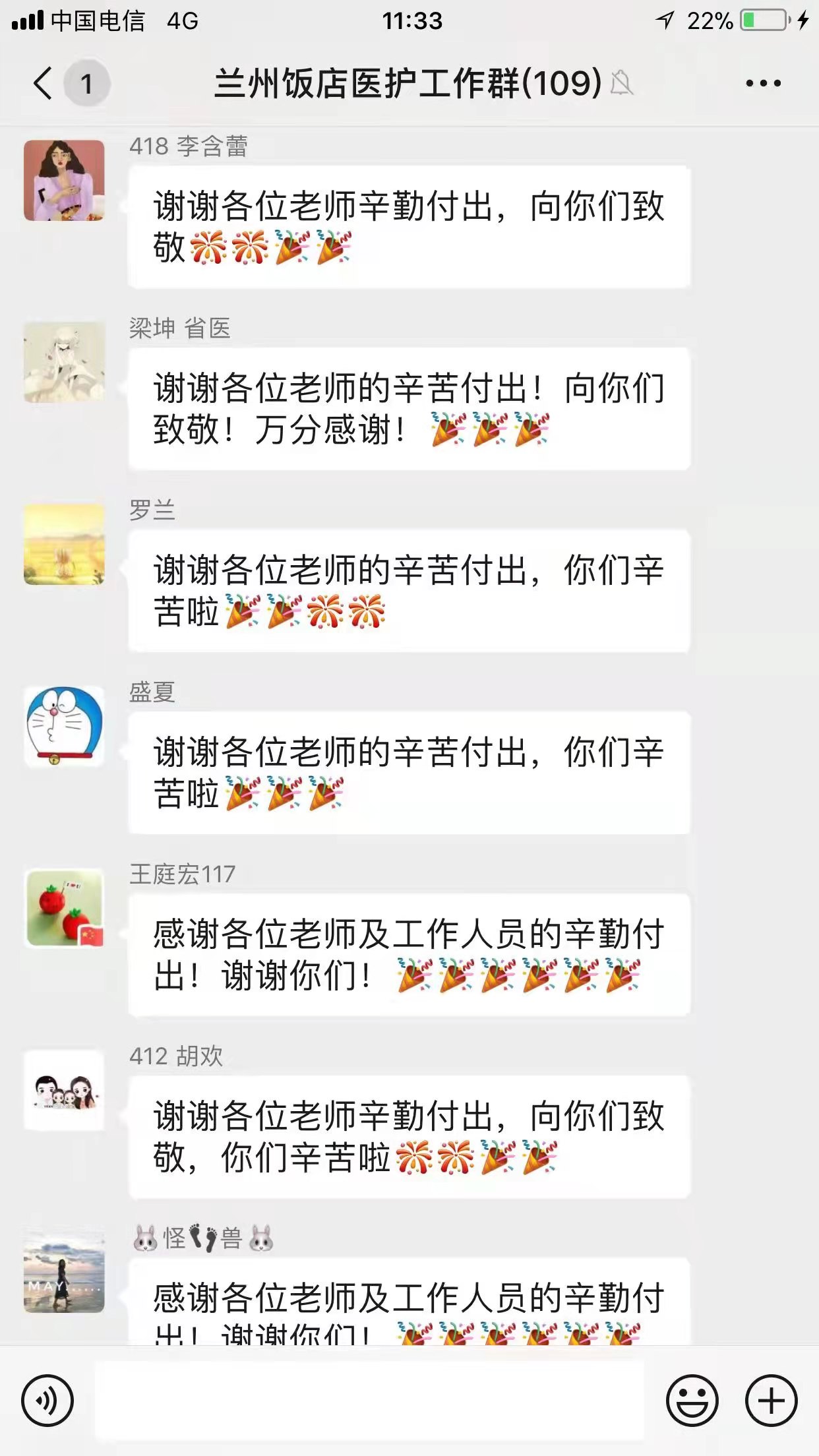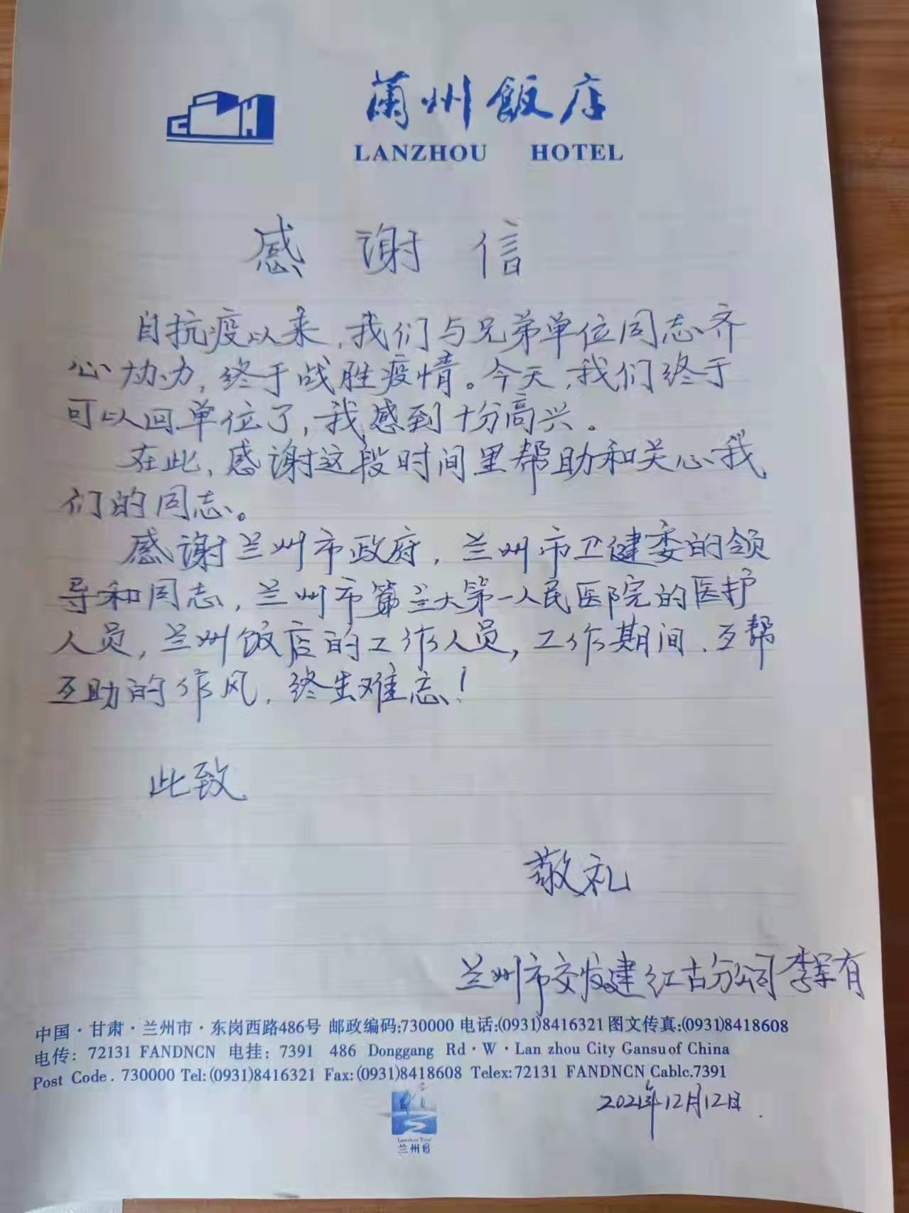 抗擊新冠肺炎疫情,事關(guān)大局,關(guān)乎每個(gè)人的生命安全與身體健康。疫情發(fā)生后,飯店領(lǐng)導(dǎo)和所有黨員干部主動(dòng)擔(dān)當(dāng)、敢于作為,堅(jiān)持工作在一線,體現(xiàn)了飯店的社會(huì)責(zé)任,為疫情防控積極奉獻(xiàn)力量。隔離結(jié)束后,醫(yī)護(hù)人員們通過(guò)感謝信、微信和電話等方式,由衷感謝蘭州飯店服務(wù)人員的暖心陪伴和貼心服務(wù)。