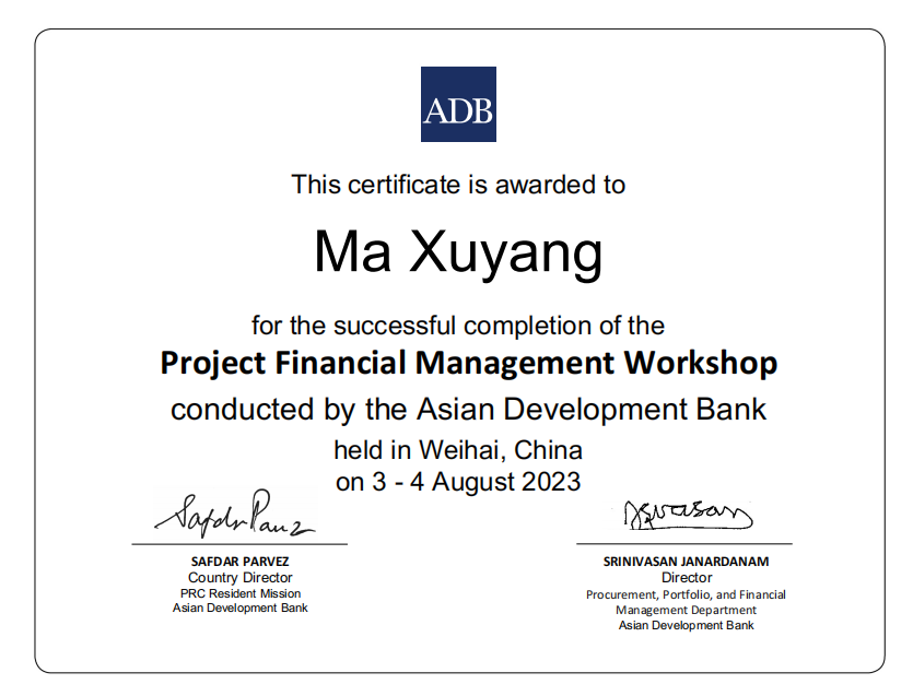 此次培訓(xùn)重點對亞行采購政策、合同管理與合同計劃、亞行財務(wù)盡職分析要求、項目會計核算、項目財務(wù)報表、項目審計等主題進(jìn)行授課。通過演講、案例研究、小組討論、結(jié)業(yè)測試及經(jīng)驗豐富的執(zhí)行機構(gòu)分享經(jīng)驗等方式使參訓(xùn)人員加深了解亞行貸款采購、財務(wù)政策/規(guī)定并拓展實踐知識。甘肅文旅集團(tuán)國際金融組織貸款項目管理辦公室一名同志代表亞行貸款甘肅環(huán)境可持續(xù)鄉(xiāng)村振興與發(fā)展項目作了大會交流發(fā)言,分享了項目管理工作中的經(jīng)驗和關(guān)注點。培訓(xùn)授課結(jié)束,三名參訓(xùn)人員獲得了結(jié)業(yè)證書。